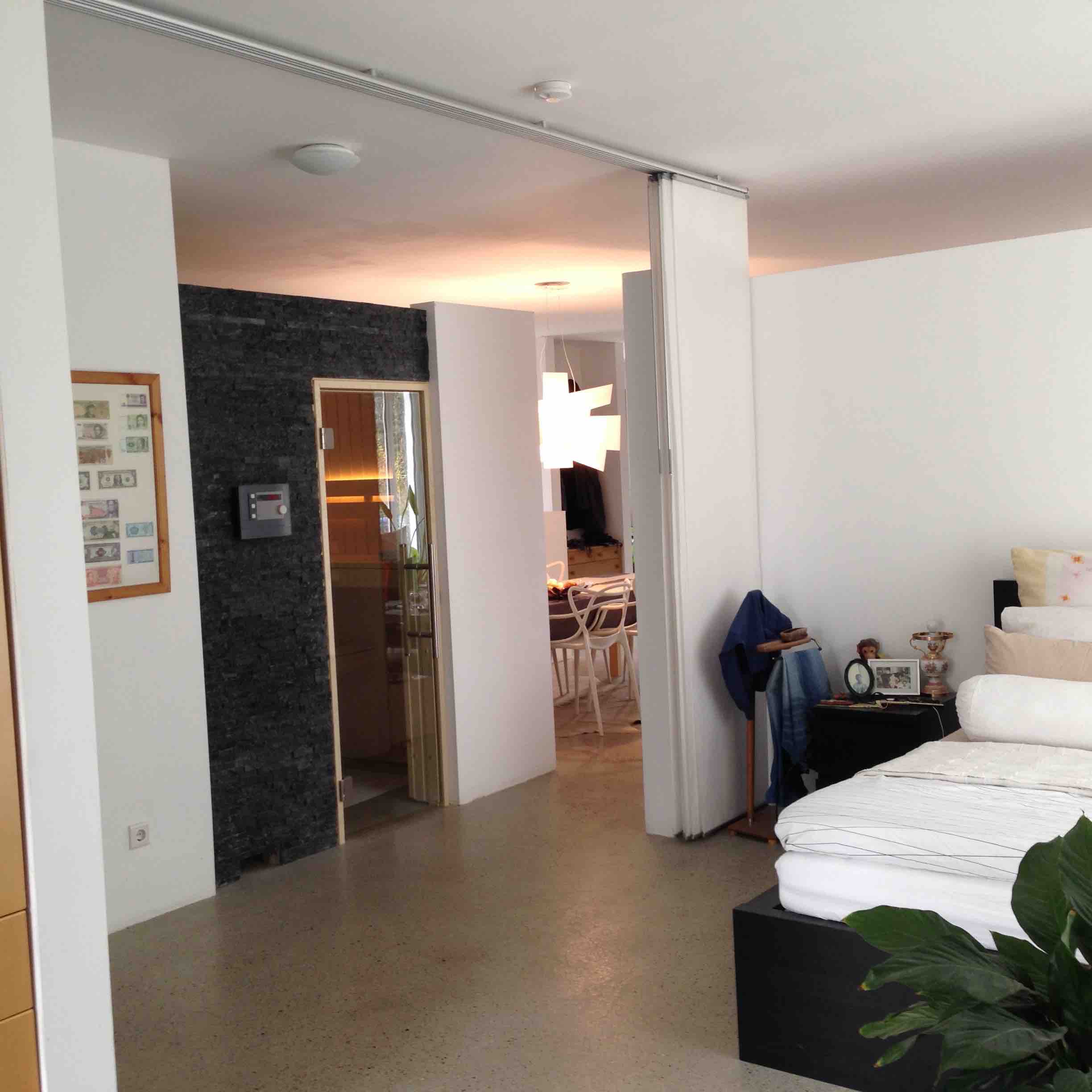 Wohnbereich mit Blick zum Schlafbereich und Bad
