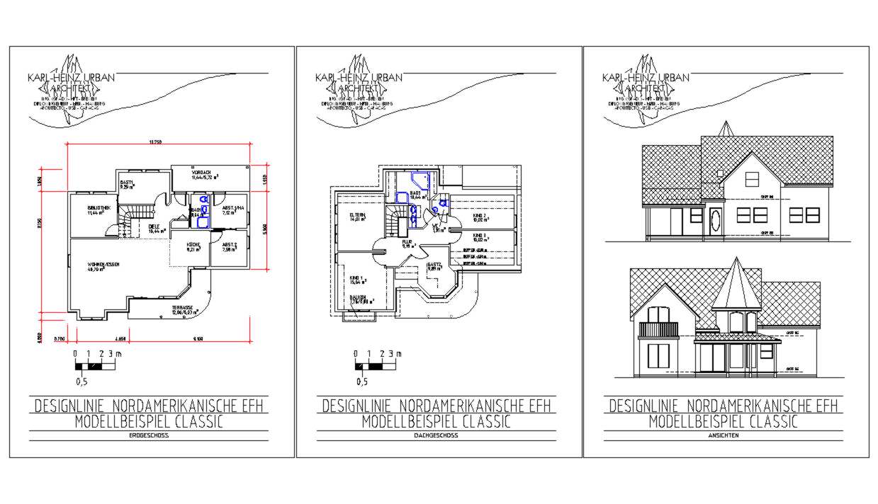 Von meinem Büro werden auch nordamerikanische Einfamilienhäuser entworfen, individuell oder nach Beispielen von Entwürfen der Drummond Designs Inc. Canada. In diesem Fall kaufen wir den Entwurf dort.