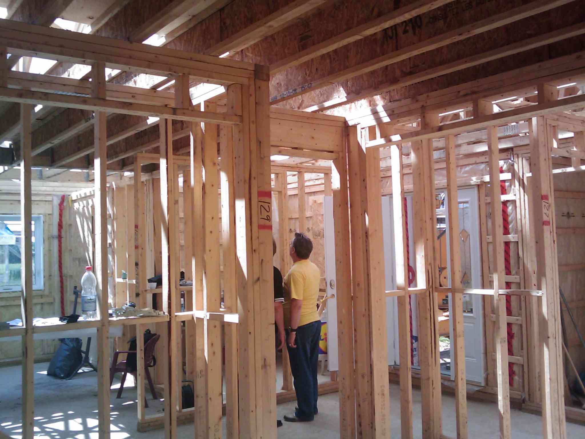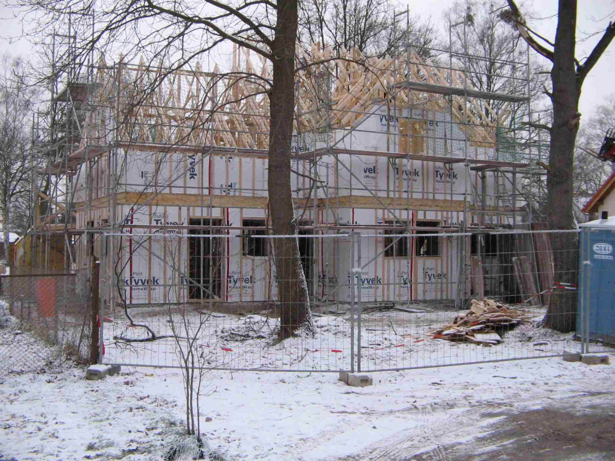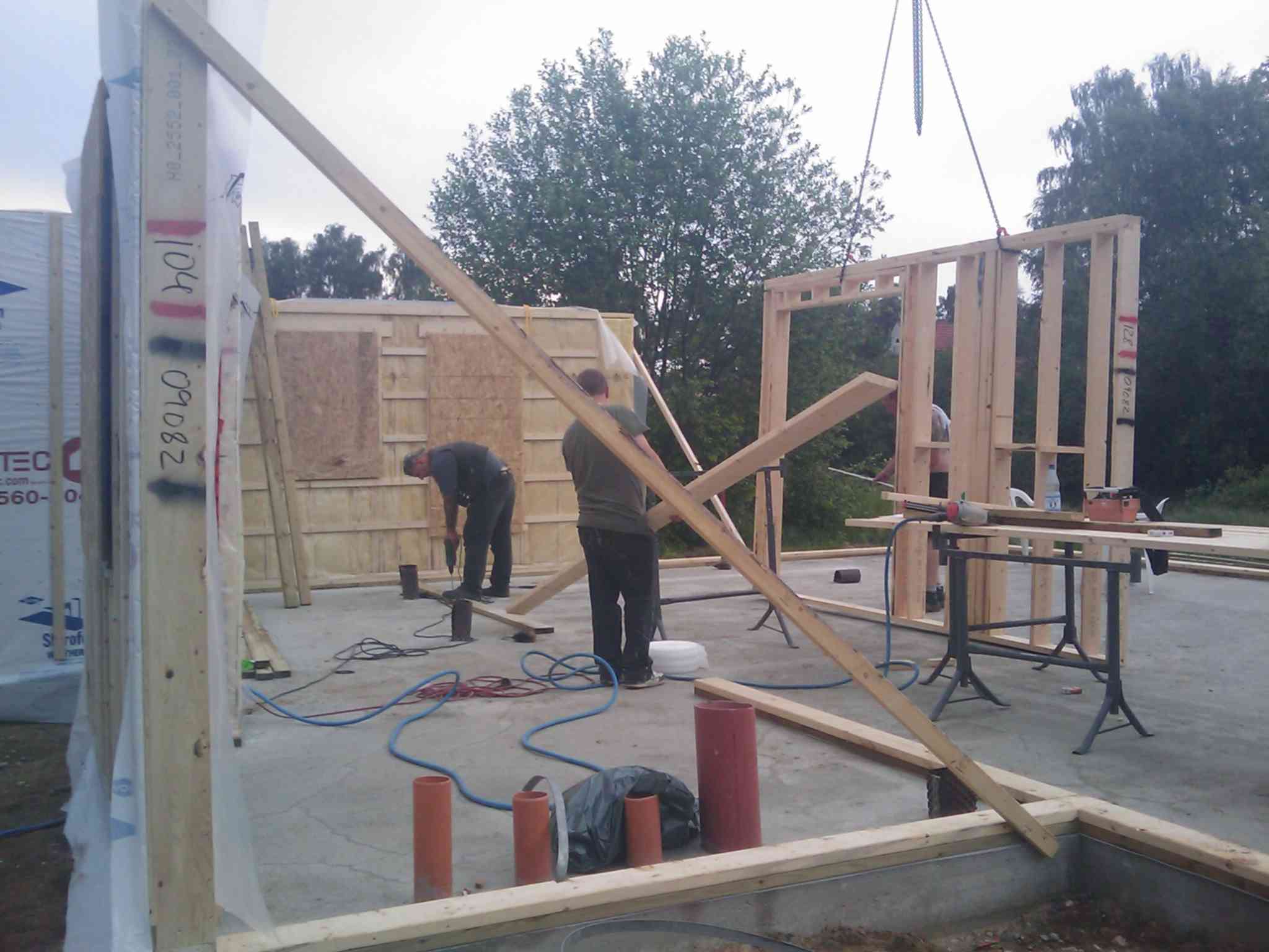 In Falkensee bei Berlin wurde ein weiteres Nordamerikanisches EFH erstellt. Der Baufortschritt wird hier dargestellt. Hier ist nach 5 Tagen die Bodenplatte inkl. Erdarbeiten erstellt und der Aufbau der Holzkonstruktion in Ausführung.