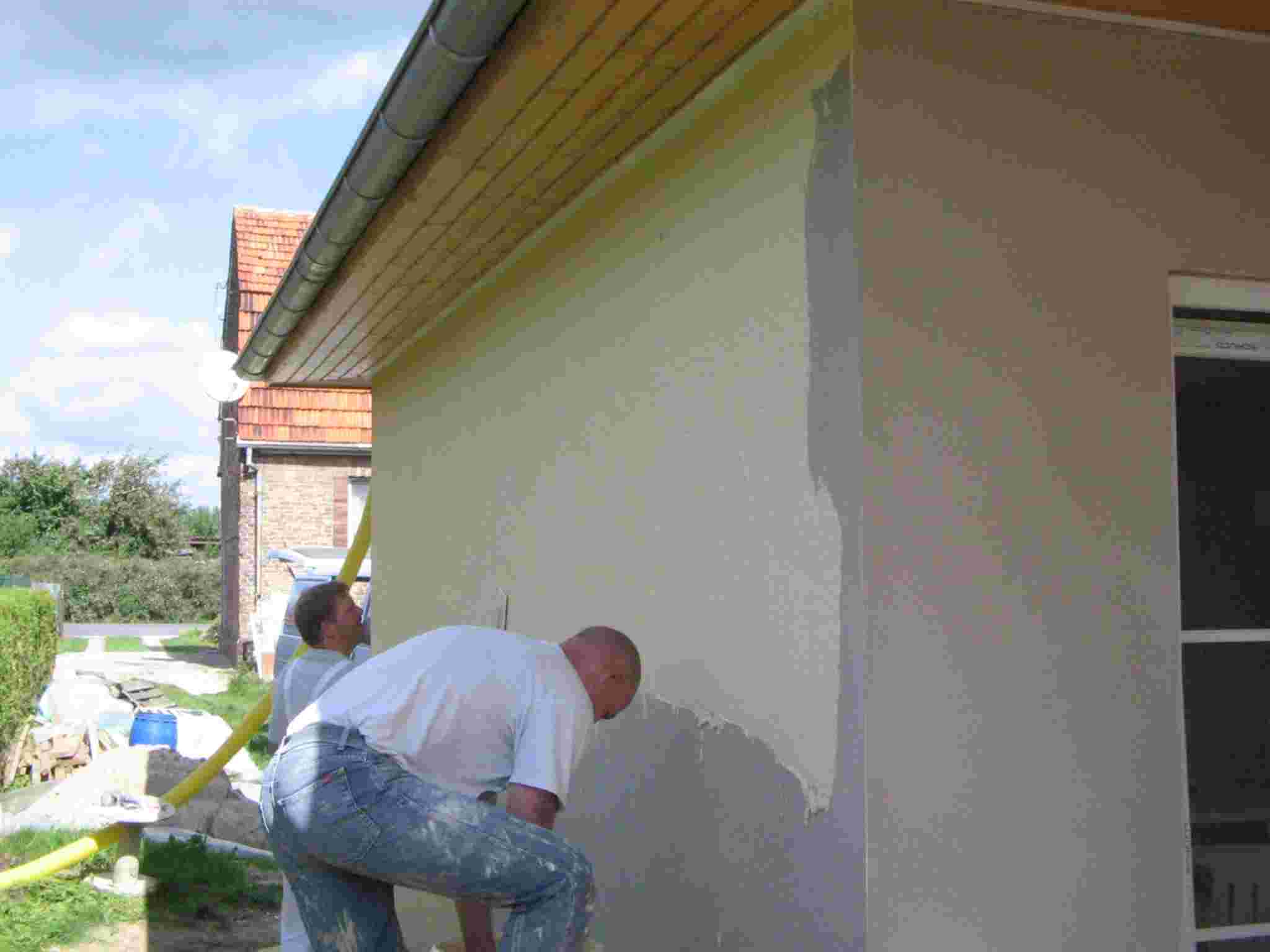 Los enlucidos exteriores de las paredes de la casa de 1 planta están finalizados. En la casa de dos plantas éstas obras están ejecutándose durante la semana en curso. El periódo de secado de la obra, ya iniciado, seguirá en curso durante unas dos semanas más. Luego se iniciarán las obras de terminación interna de la casa.