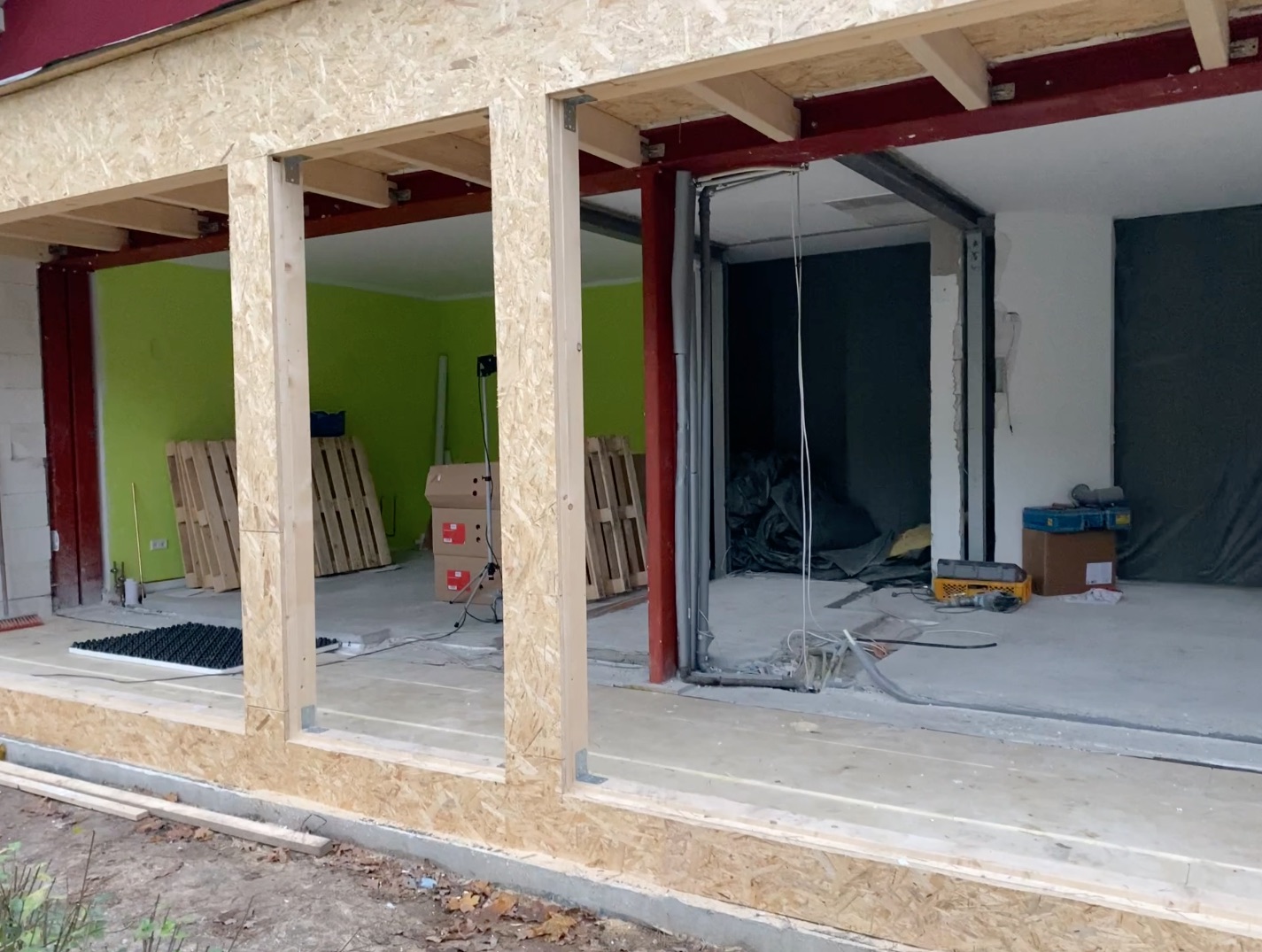 - 20201116 Within other small projects, there are 3 major projects in execution: - the home modules were developed and improved for further constructions - the remodelation of a conventional OFH to anAmerican-Style-OFH with enlargement in the garden area and second entrance situation, here some impressions of the construction phase MAIN STEEL BEAM FOR SUPPORT OF THE BRICK WALL SUBSTITUTION TO THE GARDEN AMPLIFIED
